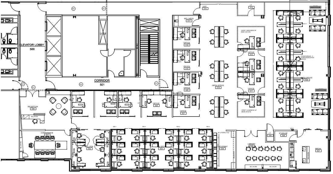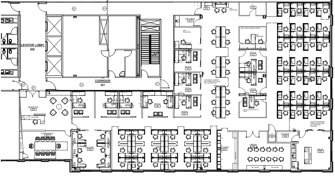 Above, I am showing one of the markup rounds we did on the new furniture layout and selection for the reconfiguration. The shaded desks and seats were existing that we would be moving around. The desks that are not shaded are new, or not being touched. We left most offices untouched, only a few had changes to them. Along with our reconfiguration, employees moved desks. Most employees stayed with their same desk type they had before, which made for a nice transition.