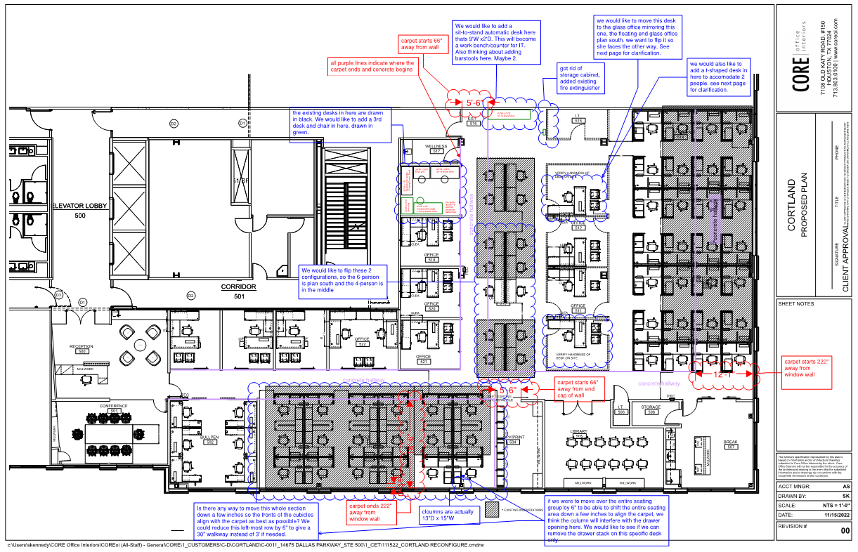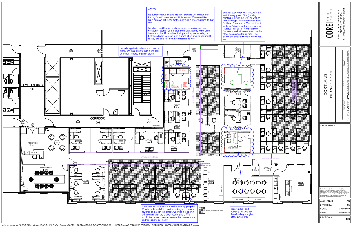 Cortland’s beautiful Dallas Corporate Office was built out and furnished in 2018, and has remained in tip-top shape. In late 2022, the Dallas employees were outgrowing the number of desks there were available. We came up with a plan to reconfigure the office and use all of the existing furniture, while adding 14 seats. I worked with a furniture manufacturer along with our EVP of Investments and our Office Concierge to accommodate needs of individual employees, teams, and simply add more seats.