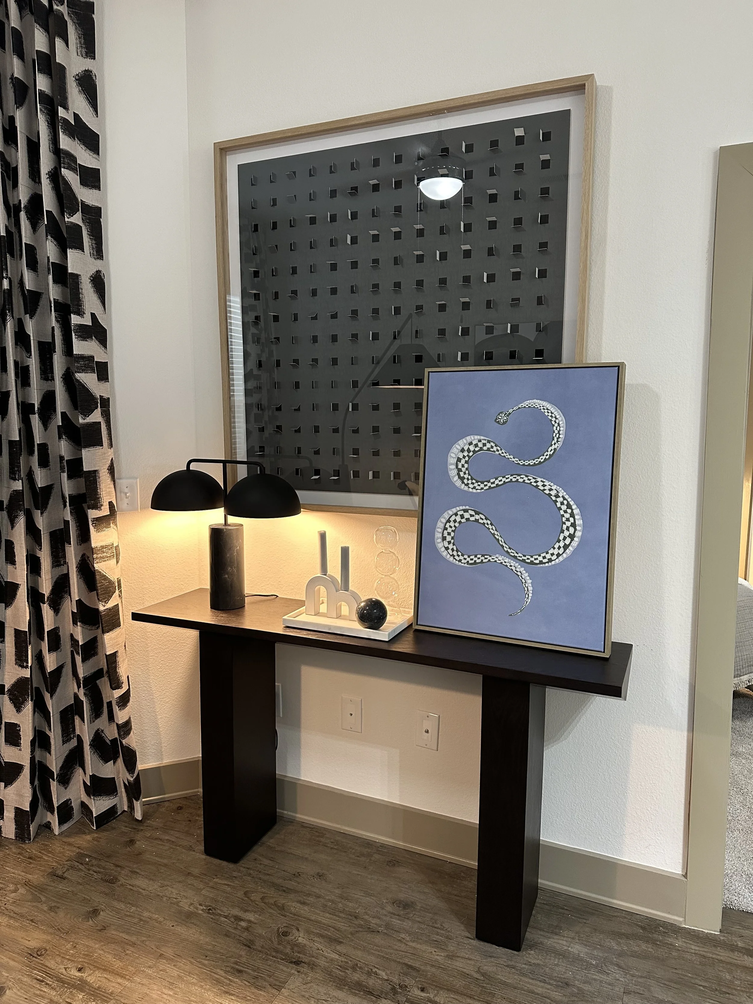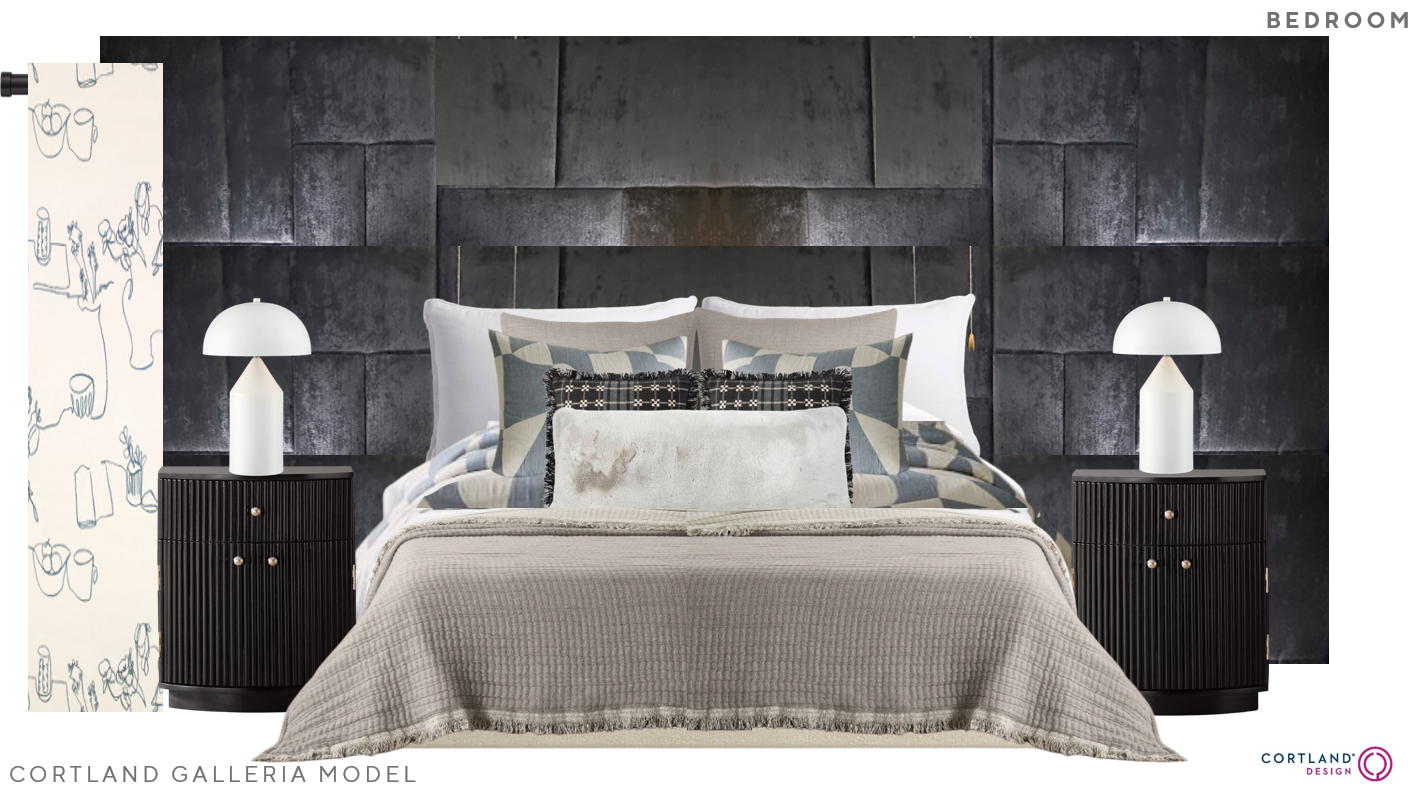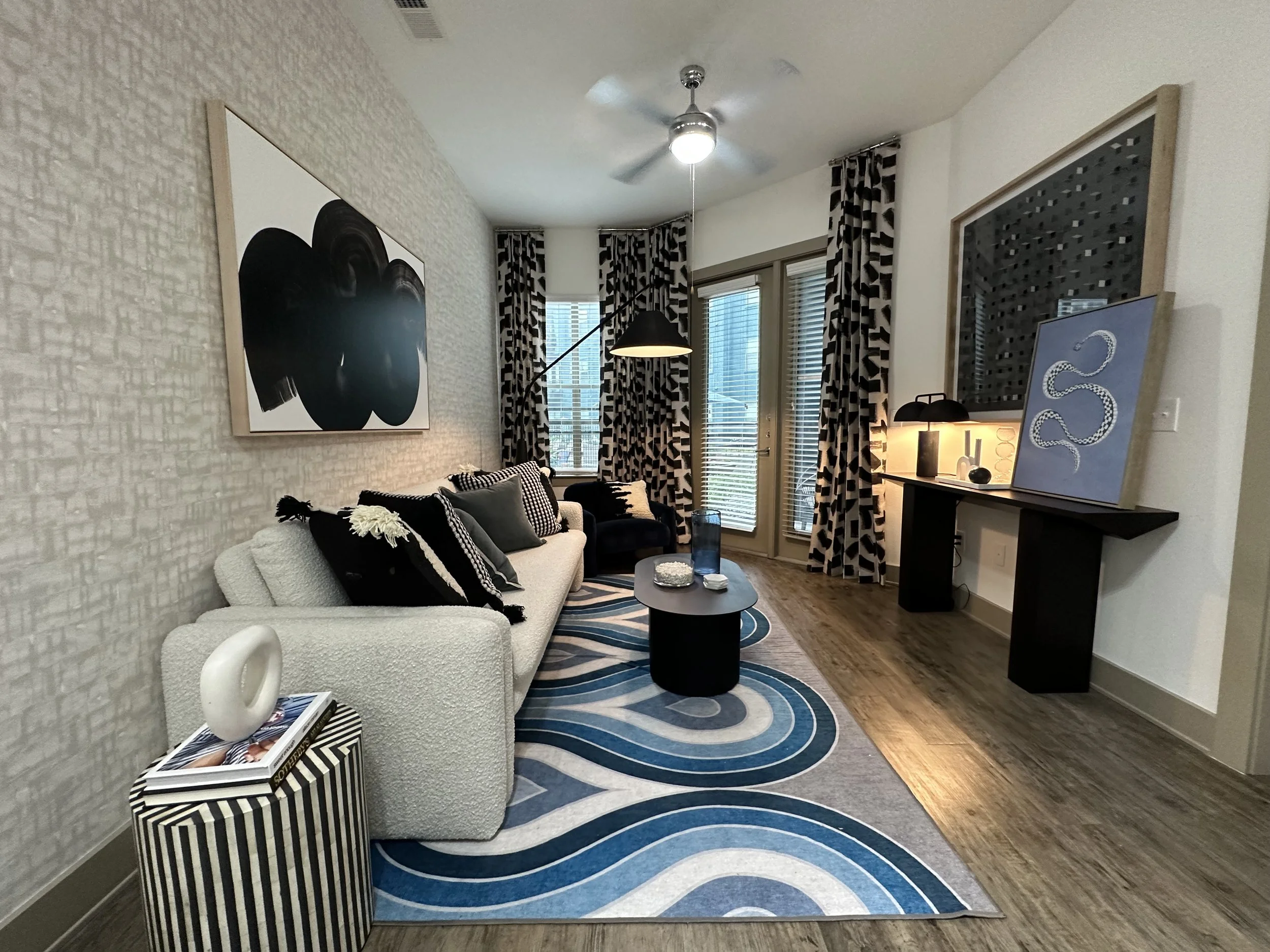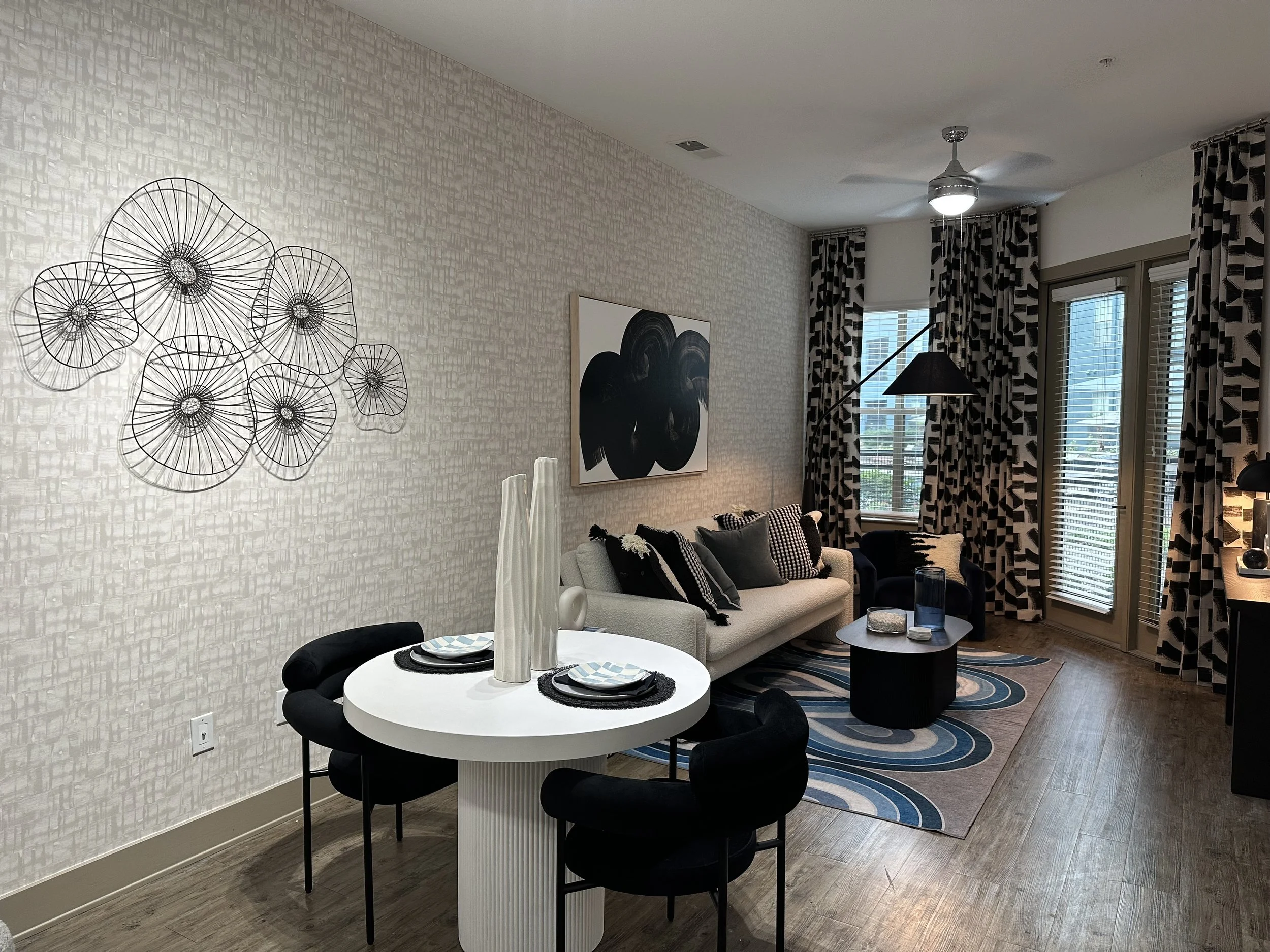 The Cortland Galleria Model is spunky and fun. There are lots of vibrant patterns around this model unit that draw your attention. This one-bed, one-bath unit features a small patio that looks over the pool, a large kitchen, and a large entertaining space. This model is unique and fits in well with the rest of the property’s feel and demographic, and will be easy for a future-resident to remember.