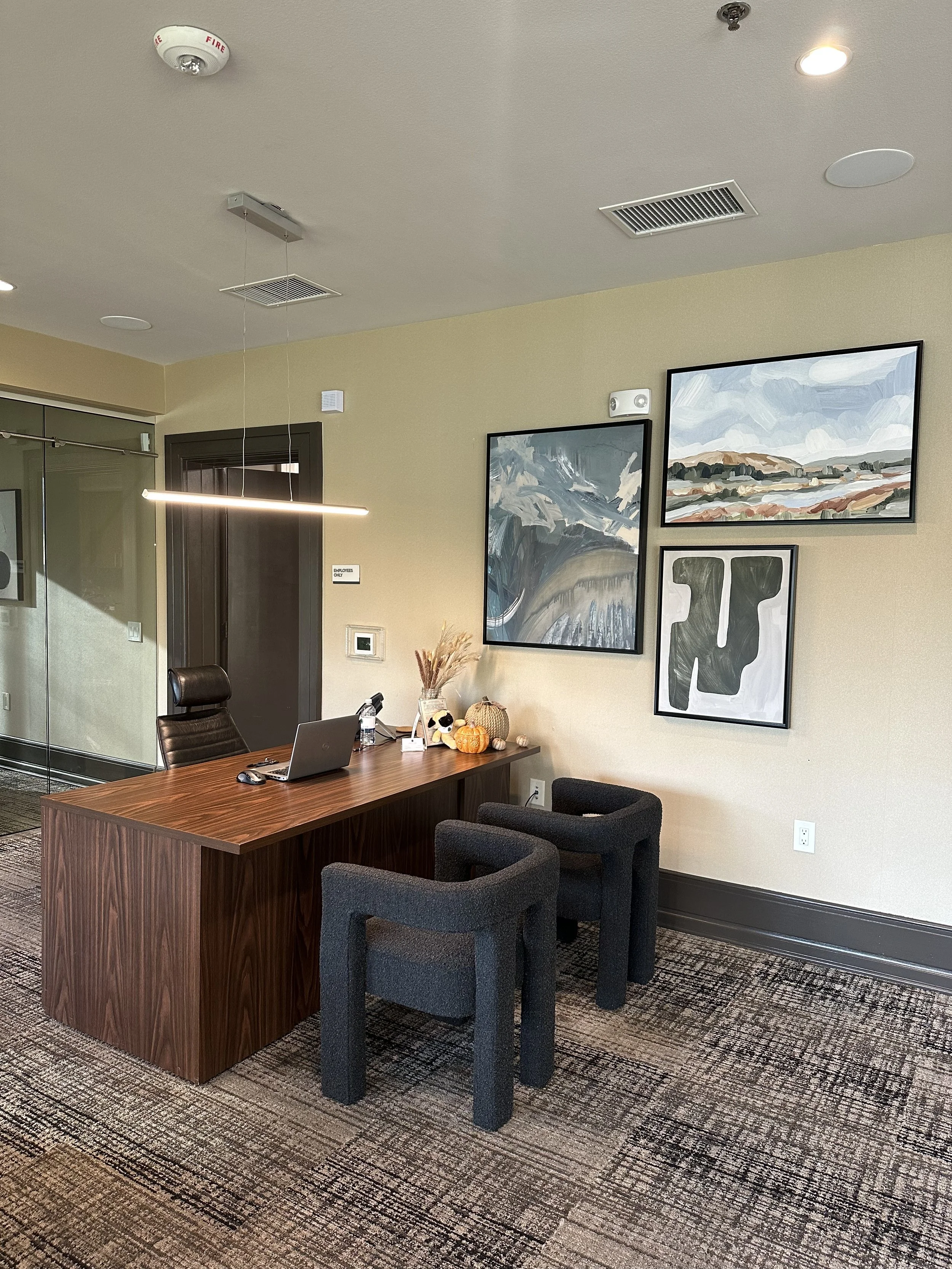 Cortland Las Colinas needed a furniture refresh. The Sky Lounge (pictured above) was a major improvement. We added new furniture and reused existing throughout the entire property. Below is the leasing office and open leasing lounge and hallway. These spaces new furniture make the biggest difference when you enter the building!