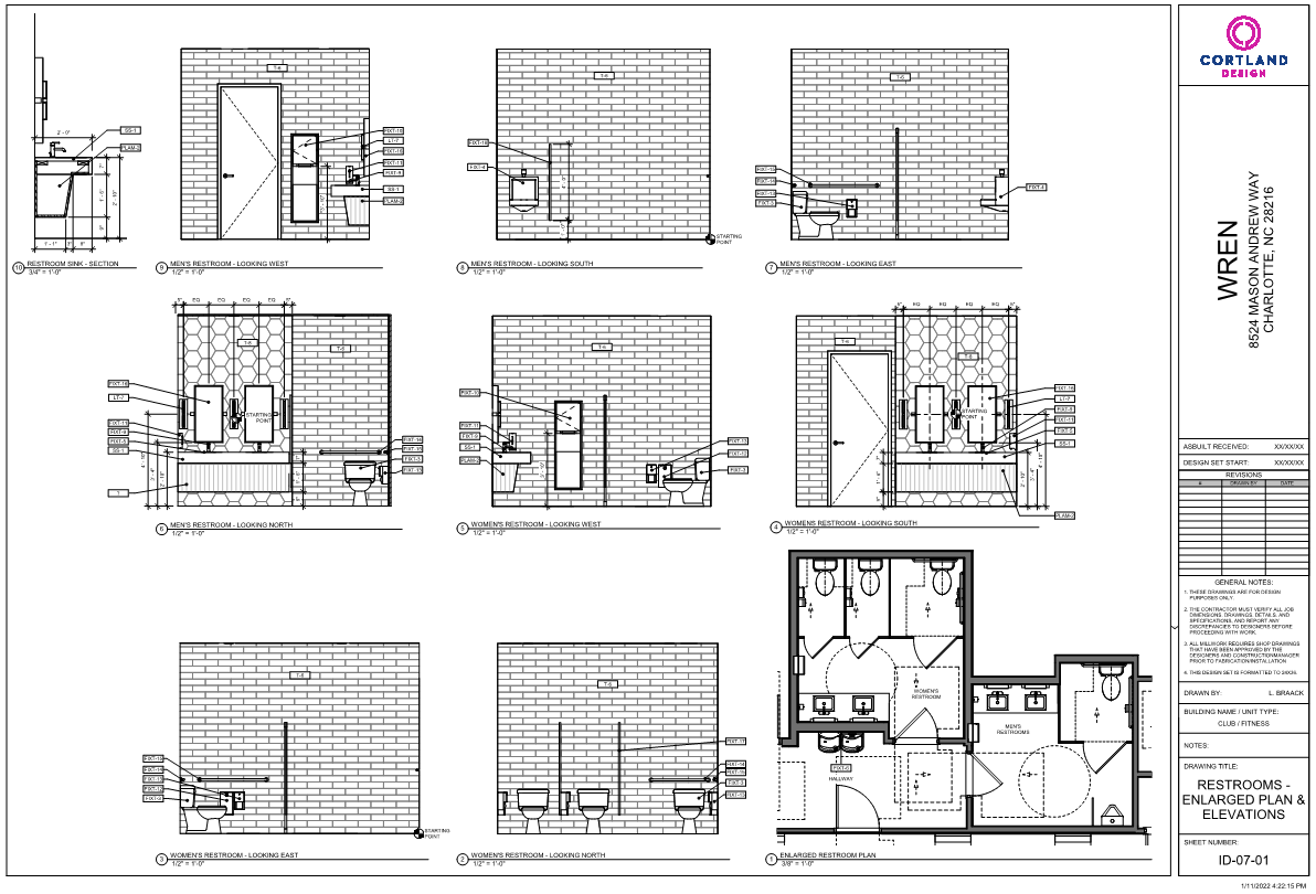 RESTROOMS - ENLARGED PLAN AND ELEVATIONS | WREN NORTHLAKE 2.0 | CHARLOTTE, NORTH CAROLINA | DECEMBER, 2021 | CORTLAND DESIGN